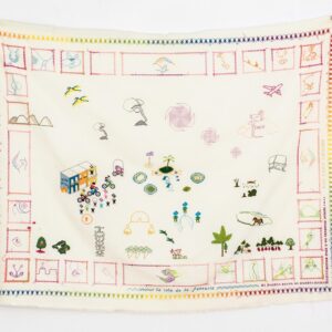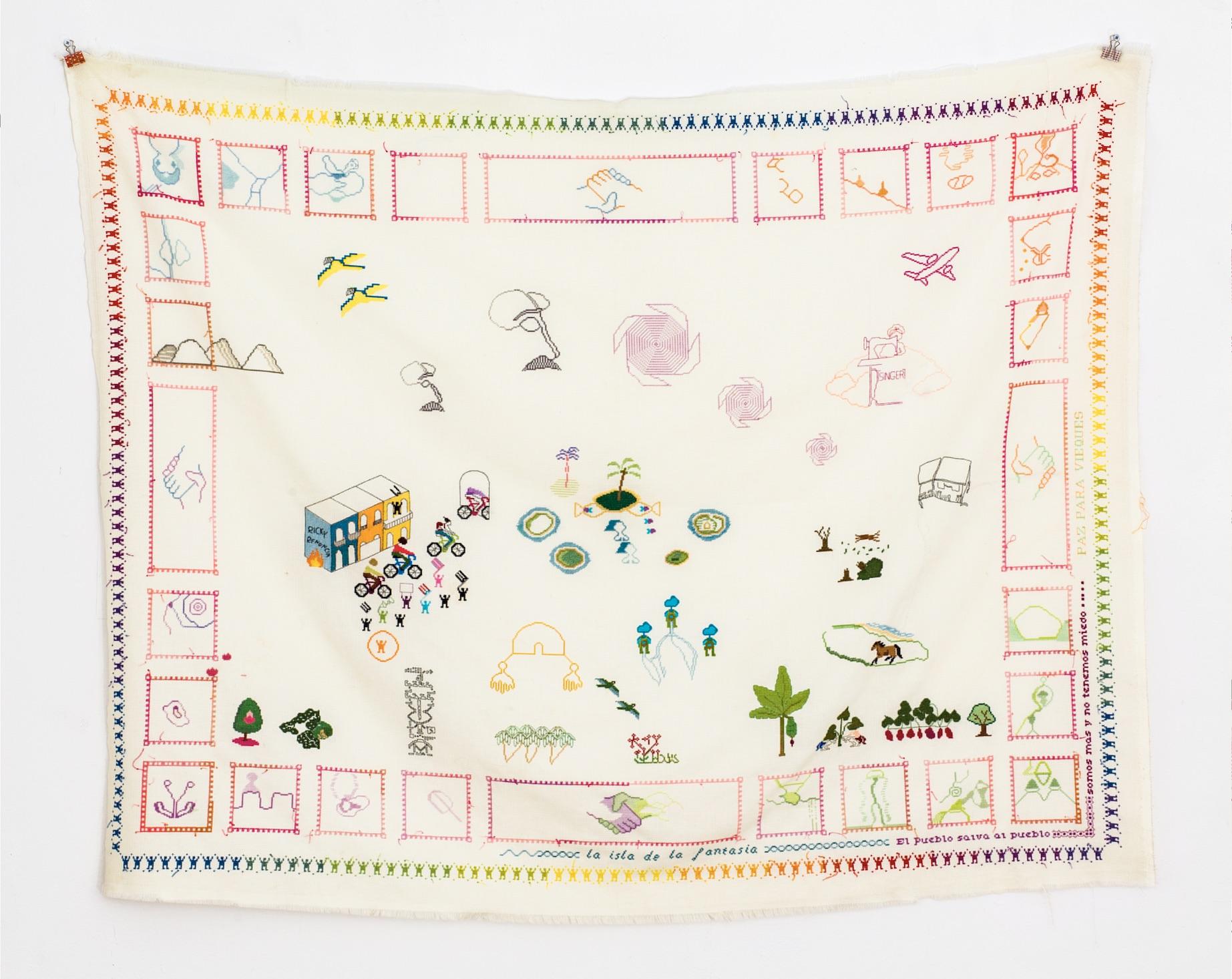 Through embroidery and textile cartography, Lulu examines Puerto Rico’s colonial condition, labor histories, and cultural memory, transforming stitching into a conceptual practice that intertwines political critique, popular culture, and collective narratives of territory and resistance.